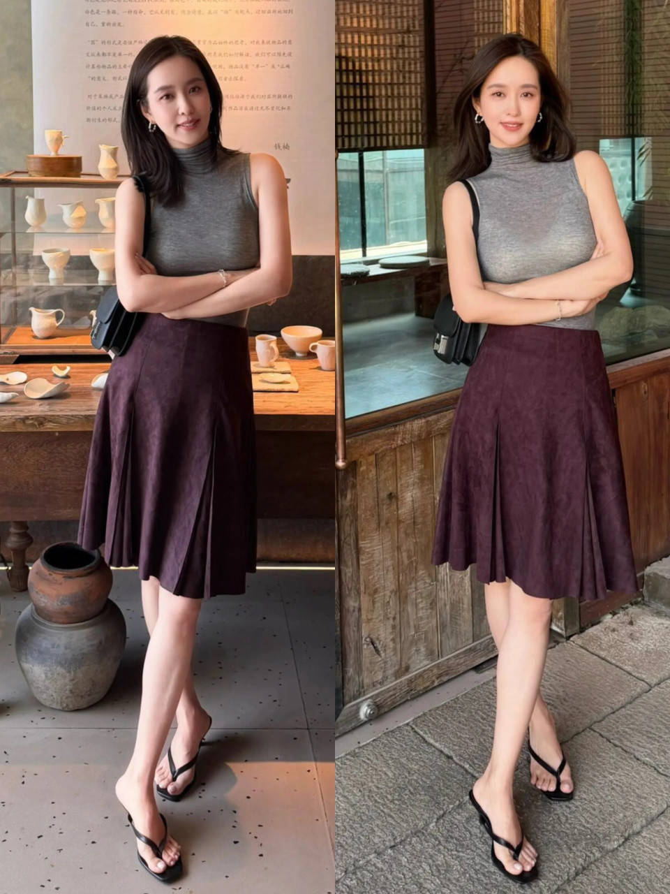 在这春夏交替的时节,可选更清爽的穿衣风格,例如,用一件灰色的修身款无袖上衣,搭配上一条紫棕色的压褶半身裙,脚踩一双黑色的高跟凉鞋,轻盈时髦,又能勾勒出凹凸有致的身形。