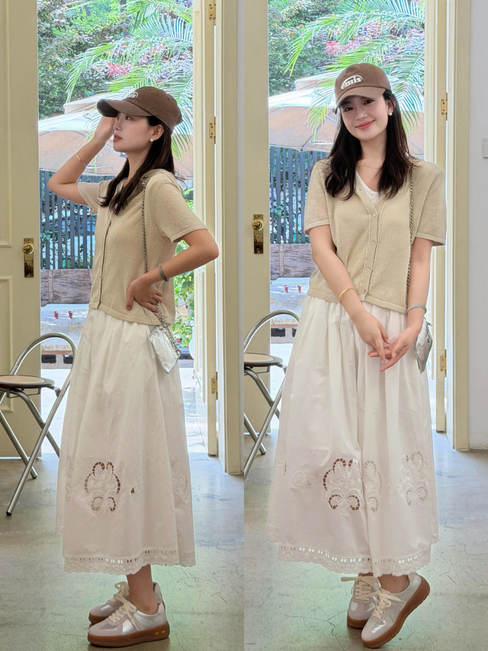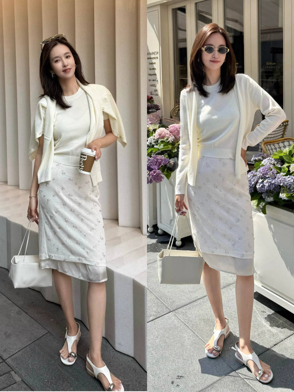 日常生活中,和闺蜜约会逛街、喝下午茶,想让自己的穿衣打扮温柔有气质,可选一件白色的针织短袖和针织开衫,配上印花的直筒半身裙,脚踩一双凉鞋,既清爽又温柔有质感。