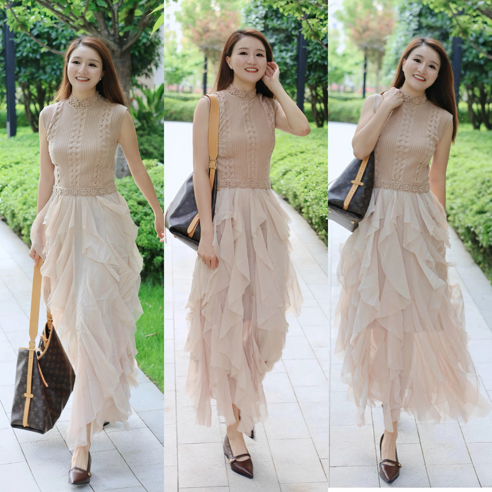 再配上一条浅卡其色的荷叶边伞裙和同色系的针织上衣,穿出属于你的优雅格调。