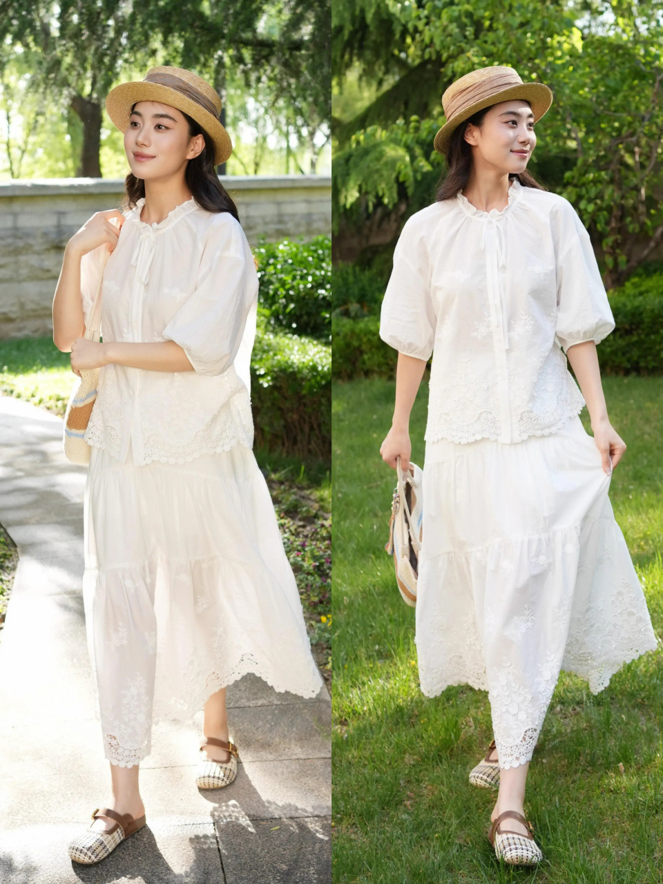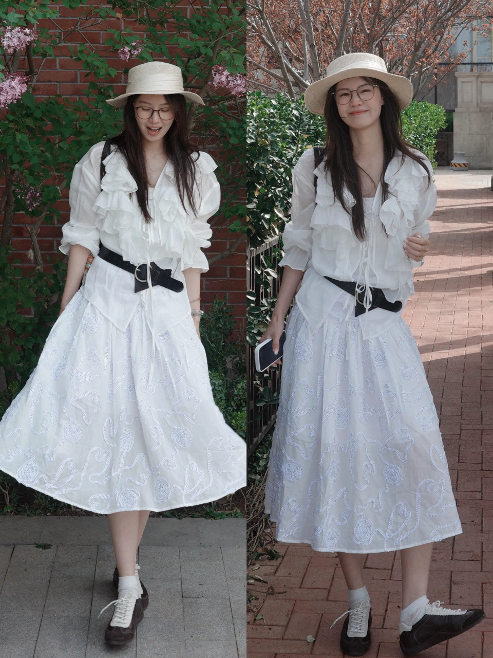 若果不想自己的穿衣打扮造型过于简单的情况下,确实可以选择像上面这一件木耳边的白色小众衬衫,配上一条印花刺绣的白色伞裙,脚踩一双德训鞋。这一身穿搭既松弛又精致。