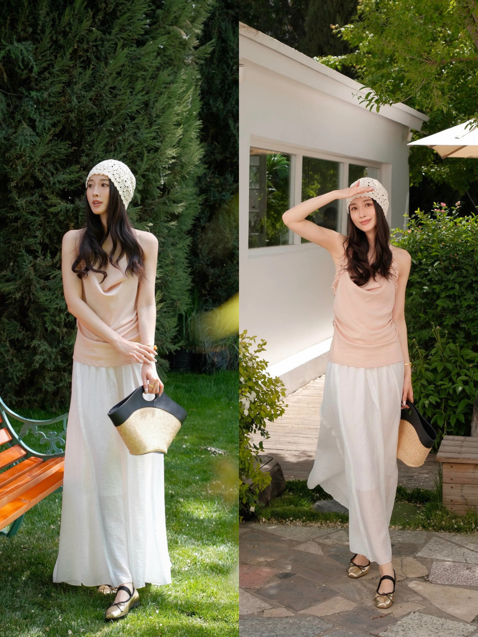 换成一双金色的玛丽珍鞋,让人看起来确实更显高贵。配上白色的散装半身裙和粉色的吊带上衣,让穿搭者显得更加温柔。
