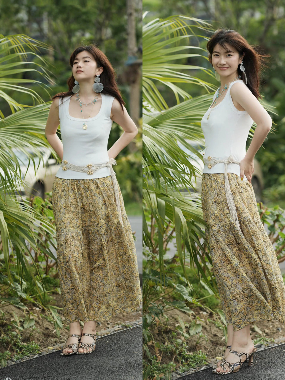 或是换成一双印花的高跟凉鞋和一条碎花的半身裙组合。再配上白色的背心上衣这种繁简结合搭配,更容易解决穿衣造型过于单调问题,显得更精致。