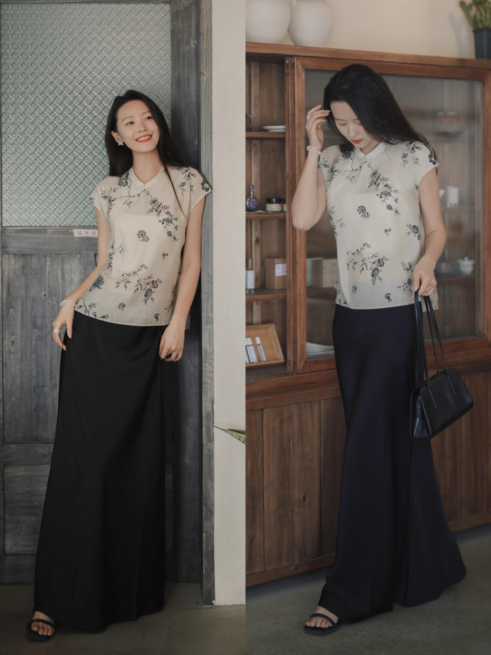 炎热的夏天少不了的就是一双黑色的凉鞋,配上一条黑色缎绸面料直筒半身裙和新中式的印花衬衫上衣,显得简约又耐看,轻松打造出别致的穿搭。