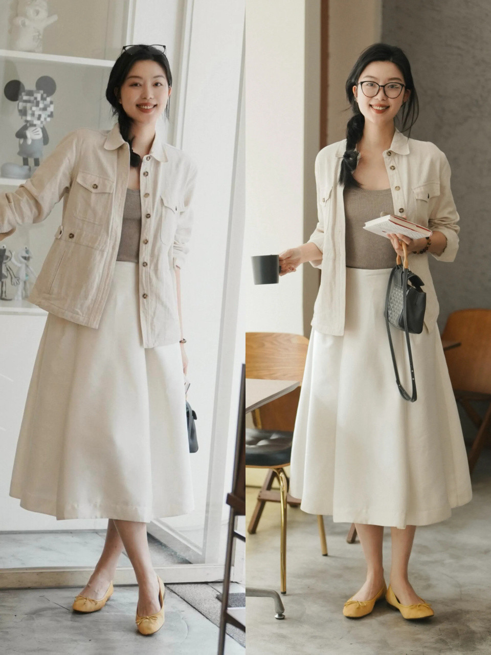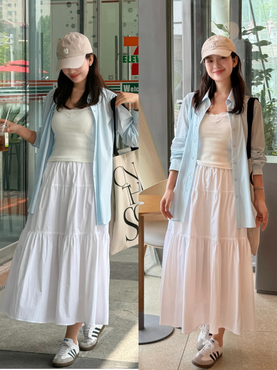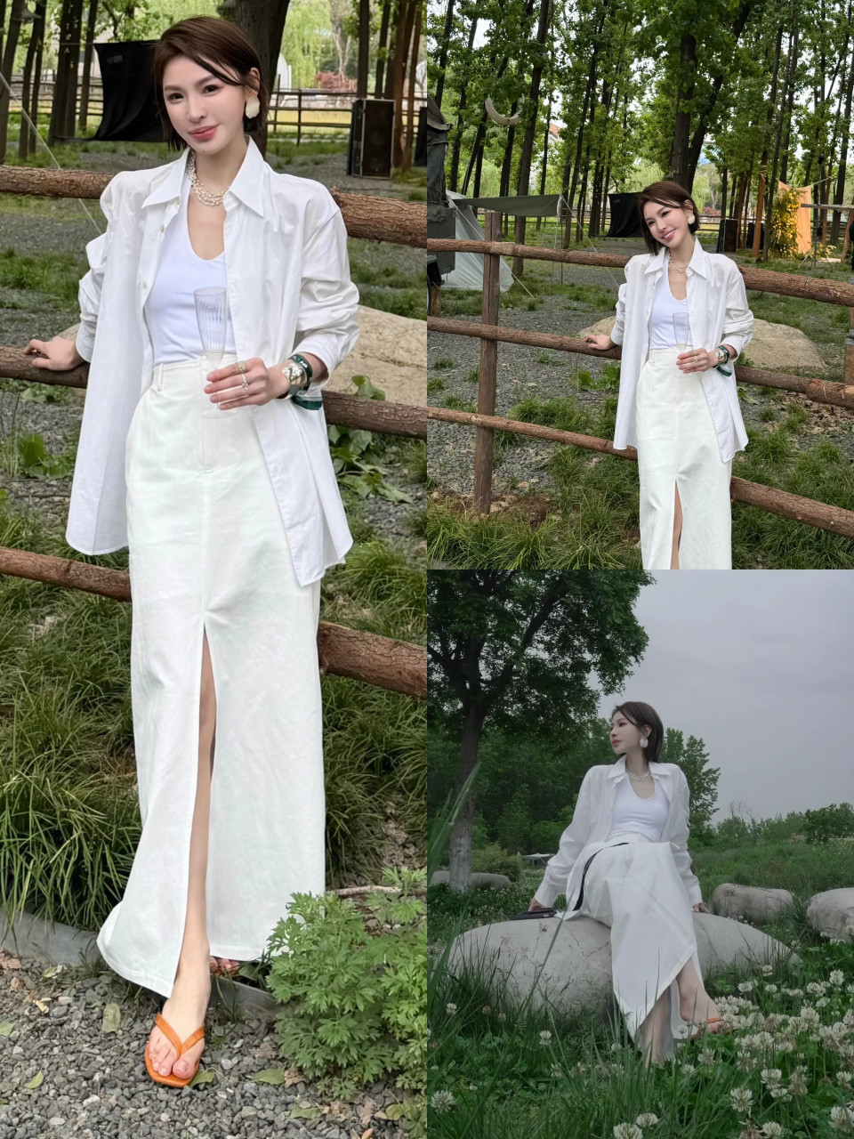 最简单的就直接选择白色衬衫搭配上白色的直筒半裙,内搭白色 T 恤,这样的基础色穿衣造型简约耐看,不挑人不挑肤色,谁穿谁好看。