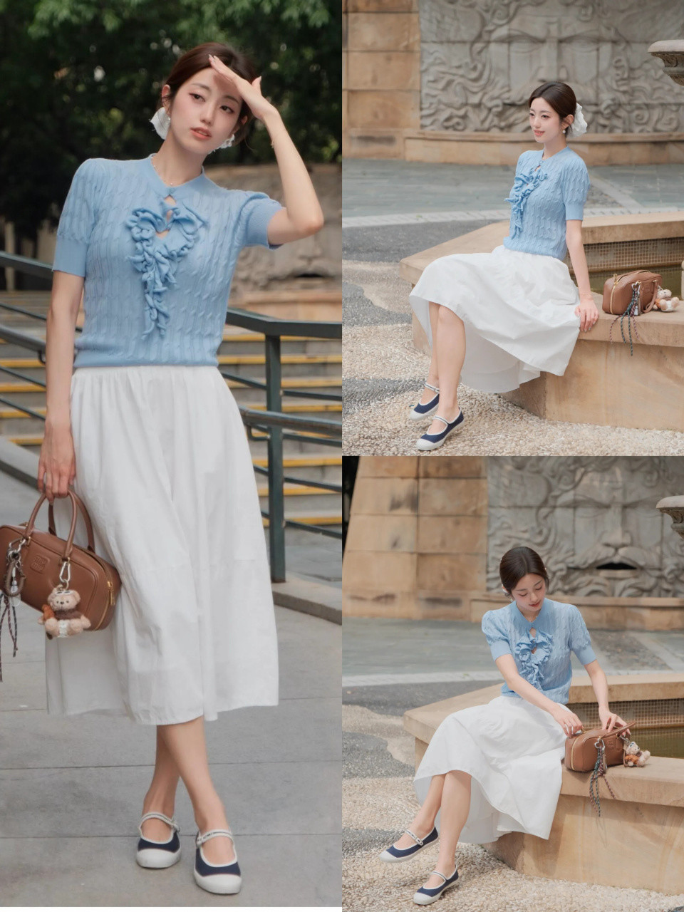 针织衣服材质穿在身上就是能呈现女性的温柔气质,但我们选择穿在身上就很有时尚感的蓝色针织短袖,搭配上白色伞裙,脚上穿的拼接式的玛丽珍鞋,可以让咱们穿出温柔优雅的气质,简约耐看,逛街,日常出门,通勤穿搭都适配。