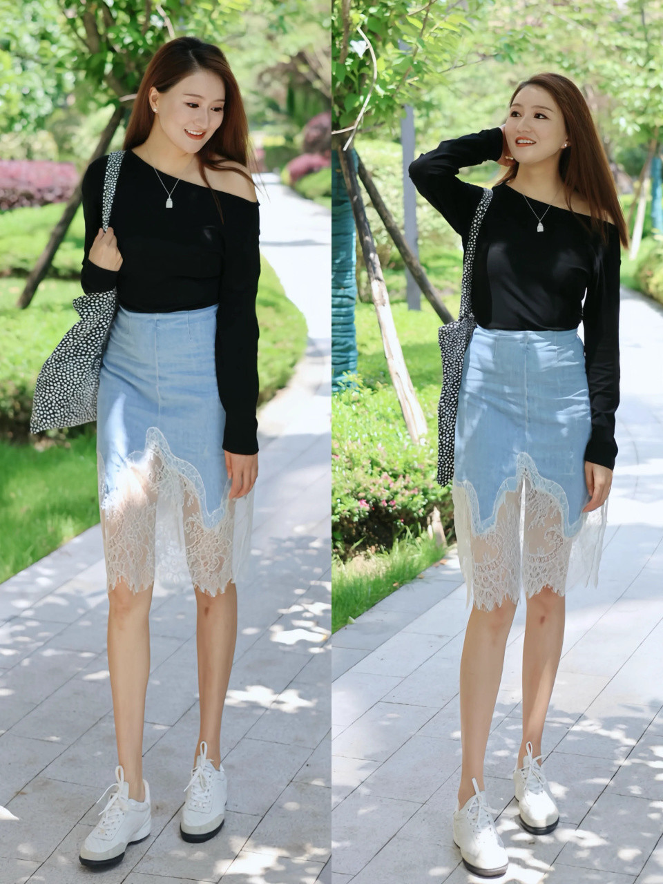 想要提升我们的腰线,确实可以采用撞色的搭配方案,比如上面用的就是黑色的一字肩针织上衣,搭配上蓝色的牛仔直筒半裙,高腰线立刻清晰起来,显高显瘦,使得身材变成三七分比例。