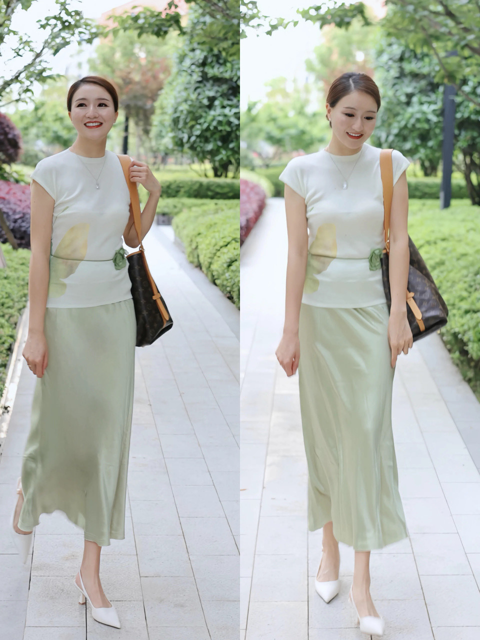 当我们去公园散步时。有着绿油油的花草树木,不妨选择一套淡绿色的裙装来穿搭,更容易打破穿衣造型配色过于单调,沉闷问题,让咱们轻松拿捏清新春夏氛围气息。